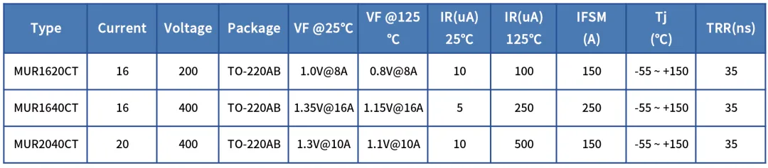 在音响电源、电动自行车充电器、多串锂电池充电器、LED电源领域,推荐型号:MUR1620CT、MUR1640CT、MUR2040CT。