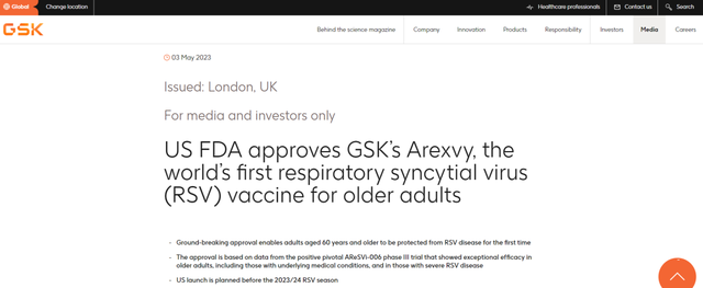 5月3日,葛兰素史克(GSK)宣布其呼吸道合胞病毒(RSV)疫苗Arexvy(RSVPreF3 OA/GSK3844766A)获FDA批准上市,用于老年人群体预防RSV感染导致的下呼吸道疾病(RSV-LRTD)。该产品是全球首款获批上市的RSV疫苗。