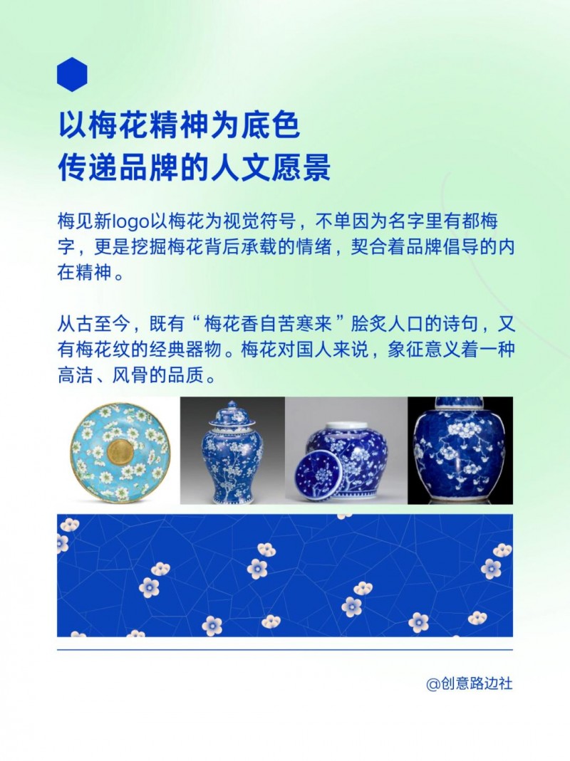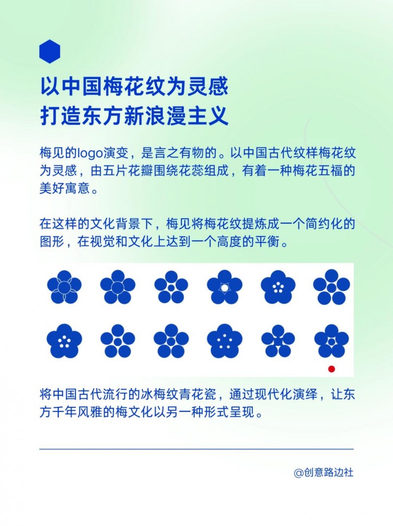 梅见的logo演变,言之有物。以中国古代纹样梅花纹为灵感,由五片花瓣围绕花蕊组成,有着一种梅花五福的美好寓意。