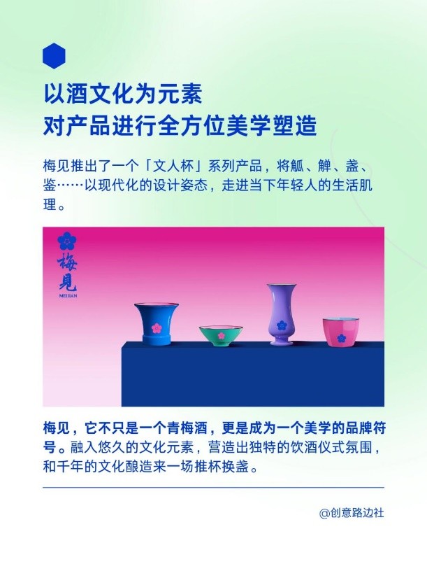 梅见,它不只是一个青梅酒,更是成为一个美学的品牌符号。融入悠久的文化元素,营造出独特的饮酒仪式氛围,和千年的文化酿造来一场推杯换盏。