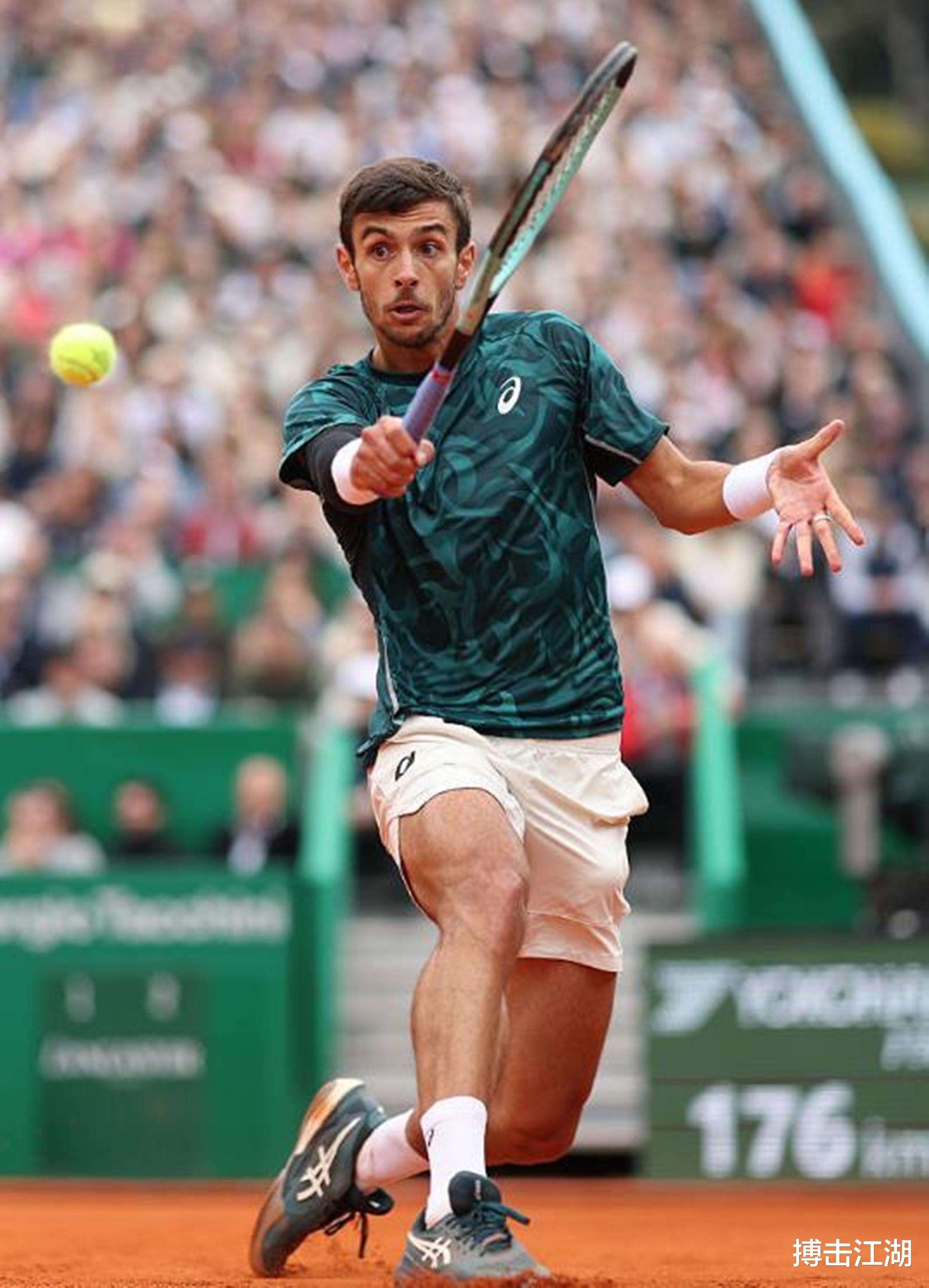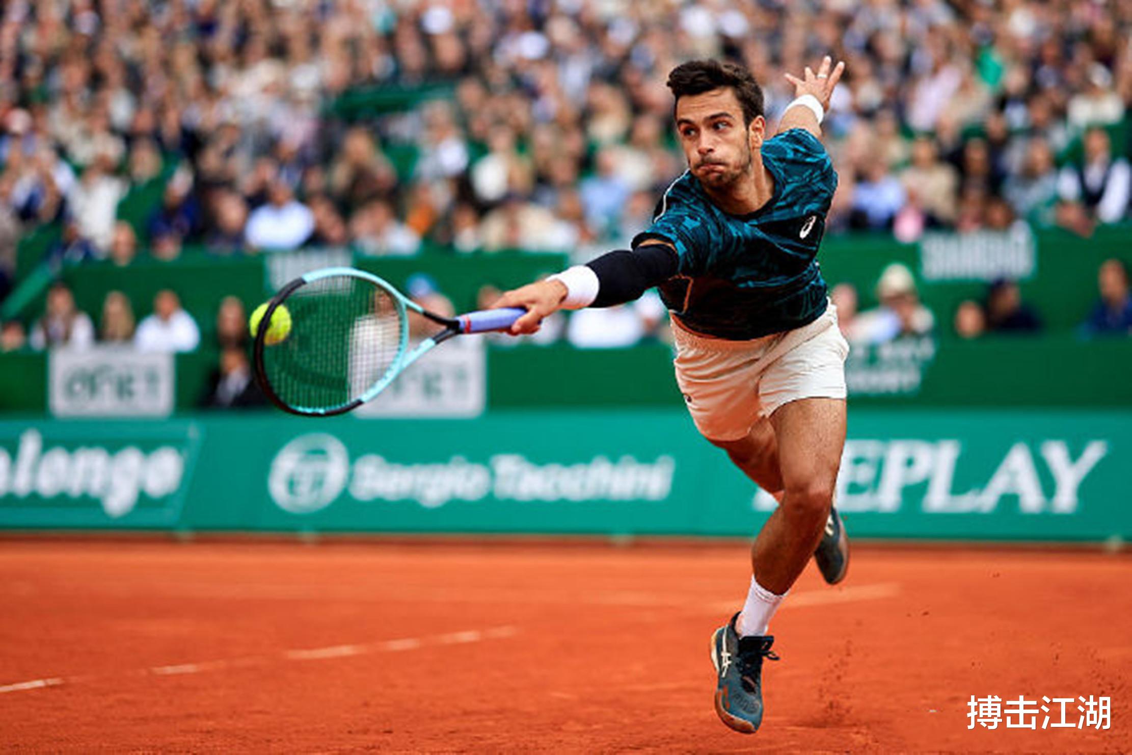 蒙特卡洛大师赛男单决赛第一盘打得蛮精彩的,可以说荡气回肠。首盘由穆塞蒂先发球,上来阿尔卡拉兹就依靠大力正手直线破发得手,赢得完美开局,但穆塞蒂随后强硬地反击,第2局和第4局都破发得手,连赢4局扭转战局,比分从0-1到4-1。