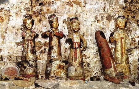 公元2011年4月30日,历经5个多月的考古发掘,一座坐落于成都龙泉驿区十陵镇青龙村一组的大型竖穴砖室墓,在沉睡千年后,重见天日。该墓内壁全彩绘,至今仍可见凤鸟、卷云图案。在墓中的出土文物中,除了不少鎏金陶俑外,还有10多件全彩绘的伎乐俑组合,俨然一支完整的宫廷乐队,展现了墓主人生前的显贵生活。这是迄今为止西南地区发现的最为精美的陶质伎乐俑组合,堪称五代时期最珍贵的历史文物之一。经过考古人员对其墓志铭的考证,确定了墓主人就是后蜀宋王赵廷隐。