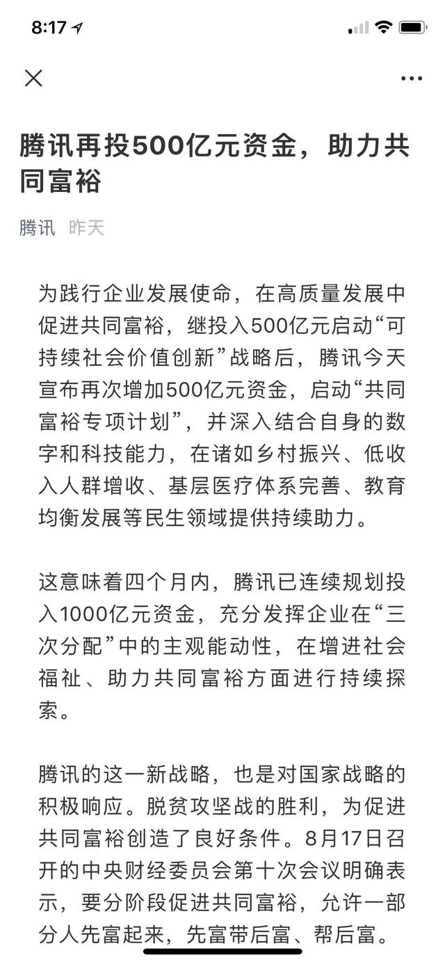 这几天腾讯响应国家指挥,为共同富裕再投五百亿。两轮直接一千亿扔出去了,但是网上风评却还是一般。