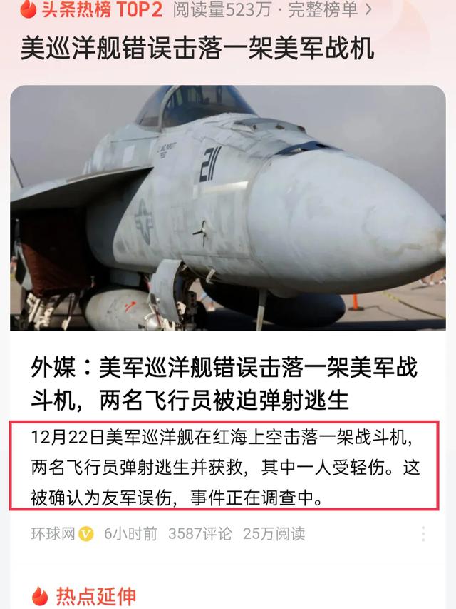 据路透社 12 月 22 日报道,当日清晨,红海之上看似风平浪静,实则暗流涌动。美国“杜鲁门”号航空母舰上起飞的一架 F/A - 18E/F“超级大黄蜂”战斗机,如往常一样执行任务。