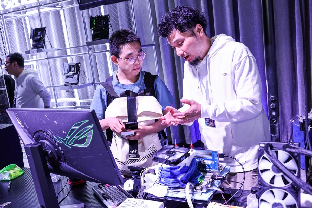 液氮超频挑战也是ROG DAY不可或缺的一部分。在超频高手饼哥的帮助下,用超频冠军主板ROG MAXIMUS Z890 APEX体验液氮超频,就能得到ROG限量版钥匙扣。来参加挑战的玩家络绎不绝,场面非常热闹。