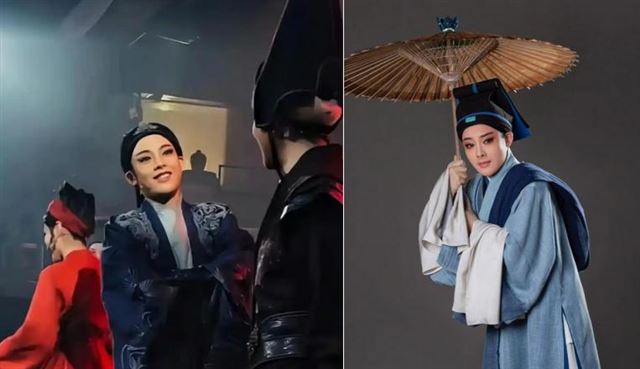 在某次演出中,她化身为英俊潇洒的“贾廷”,在舞台上诠释出角色的风流与傲气。