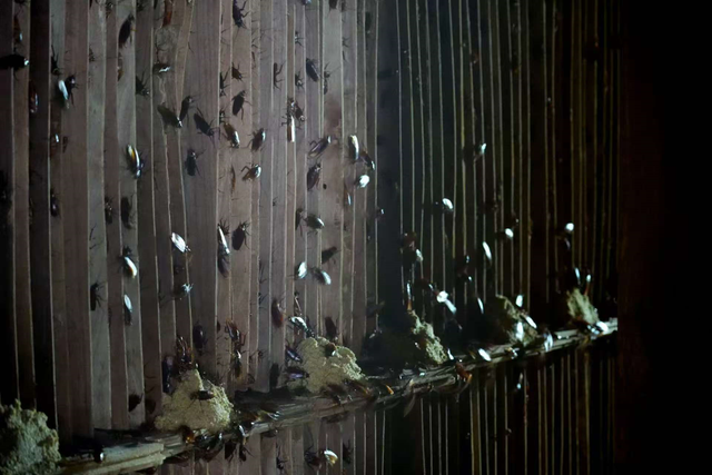 从深圳只身来此养殖美洲大蠊的公司负责人万龙为我们打开了一间养殖房。一踏入内,湿热的气息便扑面而来,一开灯,首先映入眼帘的是一排排层层叠叠整齐摆放的养殖箱,里面密密麻麻爬满了褐色的虫子。看到灯光和听到声响,美洲大蠊便纷纷往暗处躲避,发出阵阵“悉悉索索”声。房顶上、地板上、养殖箱的夹层里,到处都能看到它们爬行的身影。在万龙的带领下,我们分别参观了孵化间、幼虫间和成虫间。据他介绍,美洲大蠊喜欢潮湿温热且黑暗的环境,一般在30℃左右的环境下,并保持适当的湿度,美洲大蠊更容易生长繁殖。因此在养殖房内需要严格控制温度和湿度,灯光也很昏暗,基本有人进去才开一下灯。此外,饲料的选择也非常重要,他们使用的是五得利麸皮和内蒙古通辽玉米磨成粉后搅拌而成的优质饲料,农残和重金属均不能超标的。每天,工作人员都会按时给美洲大蠊投食和喂水,好让它们快速生长。