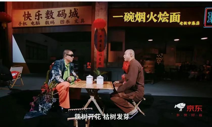 而落到铁晚本身——先说一个很有意思的小细节,在节目中途有一个刘畊宏参与的抽奖环节,是由他冲到超市货架中,能找到几台手机就会给观众抽几台;尽管只有短短一分钟时间,但正因为基于直播平台,能重现出这种旧时联欢跟观众的真相关感,还是一种挺惊喜的体验。这种反“晚会”常规的状态,在铁晚上还有更多,从舞台设计到节目构成,都在提供一种能放开自我、乐得起来的感染力。