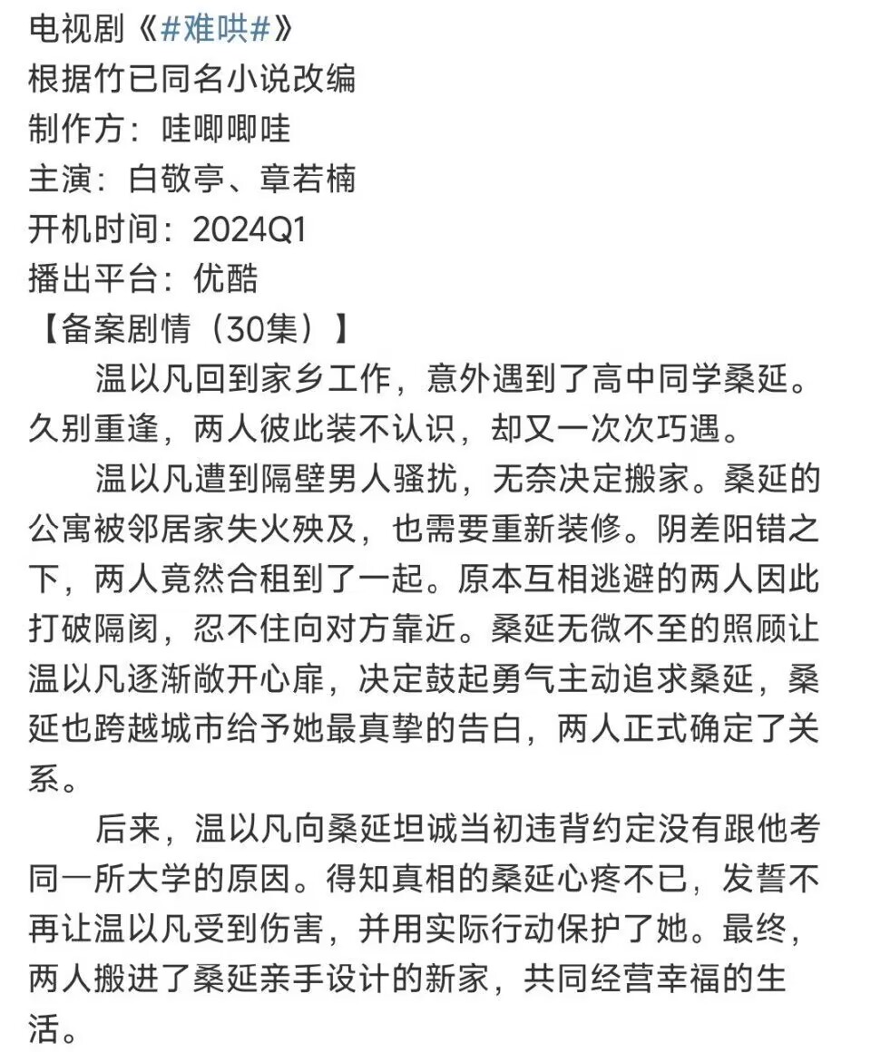 近日,《难哄》又双叒叕传出男女主角由白敬亭和章若楠饰演,且还贴心的给出了制作方、开机时间、播放平台、总集数以及备案剧情,以此想证明这次是真的一样。