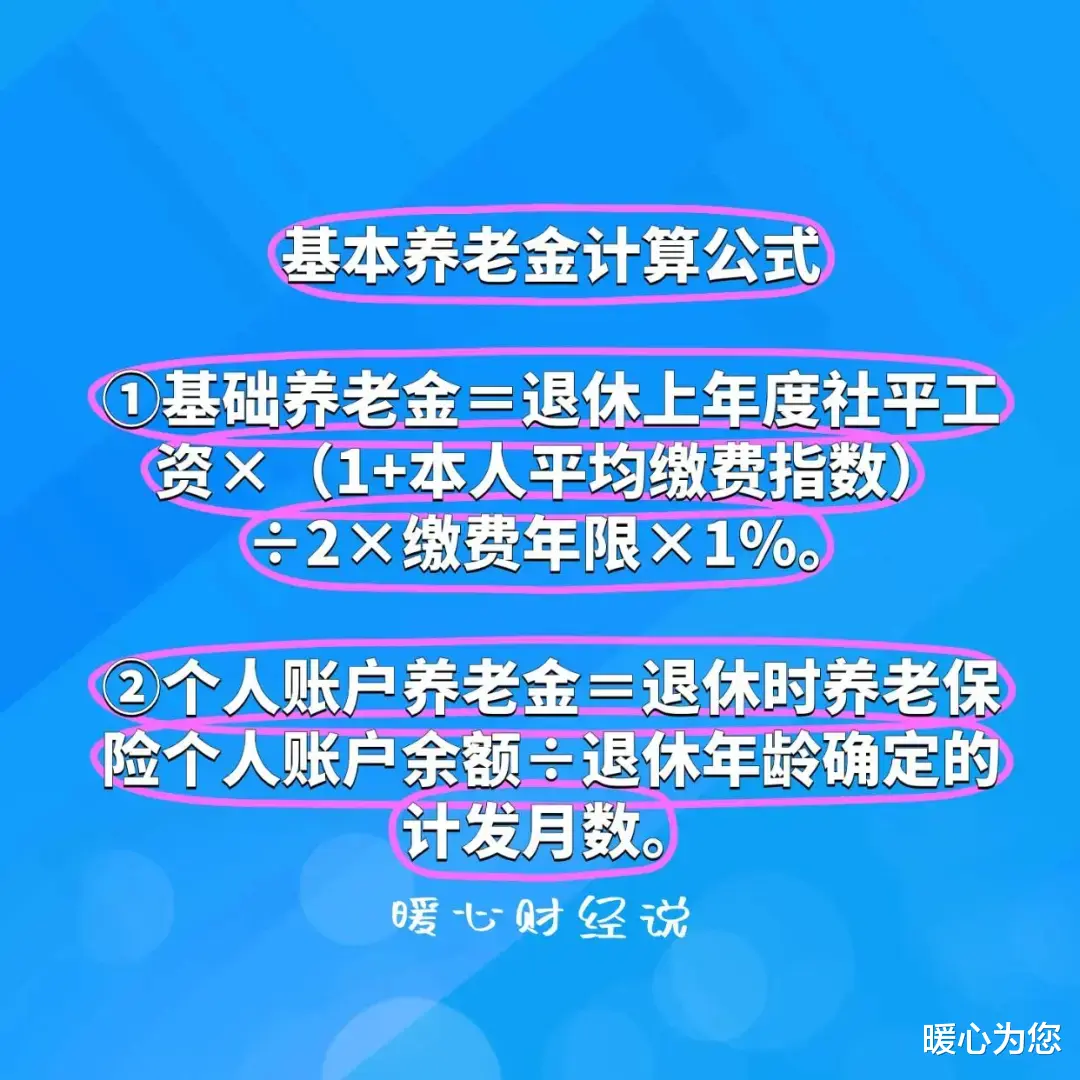 ①基础养老金计算公式等于退休上年度社会平均工资×(1+本人平均缴费指数)÷2×缴费年限×1%。