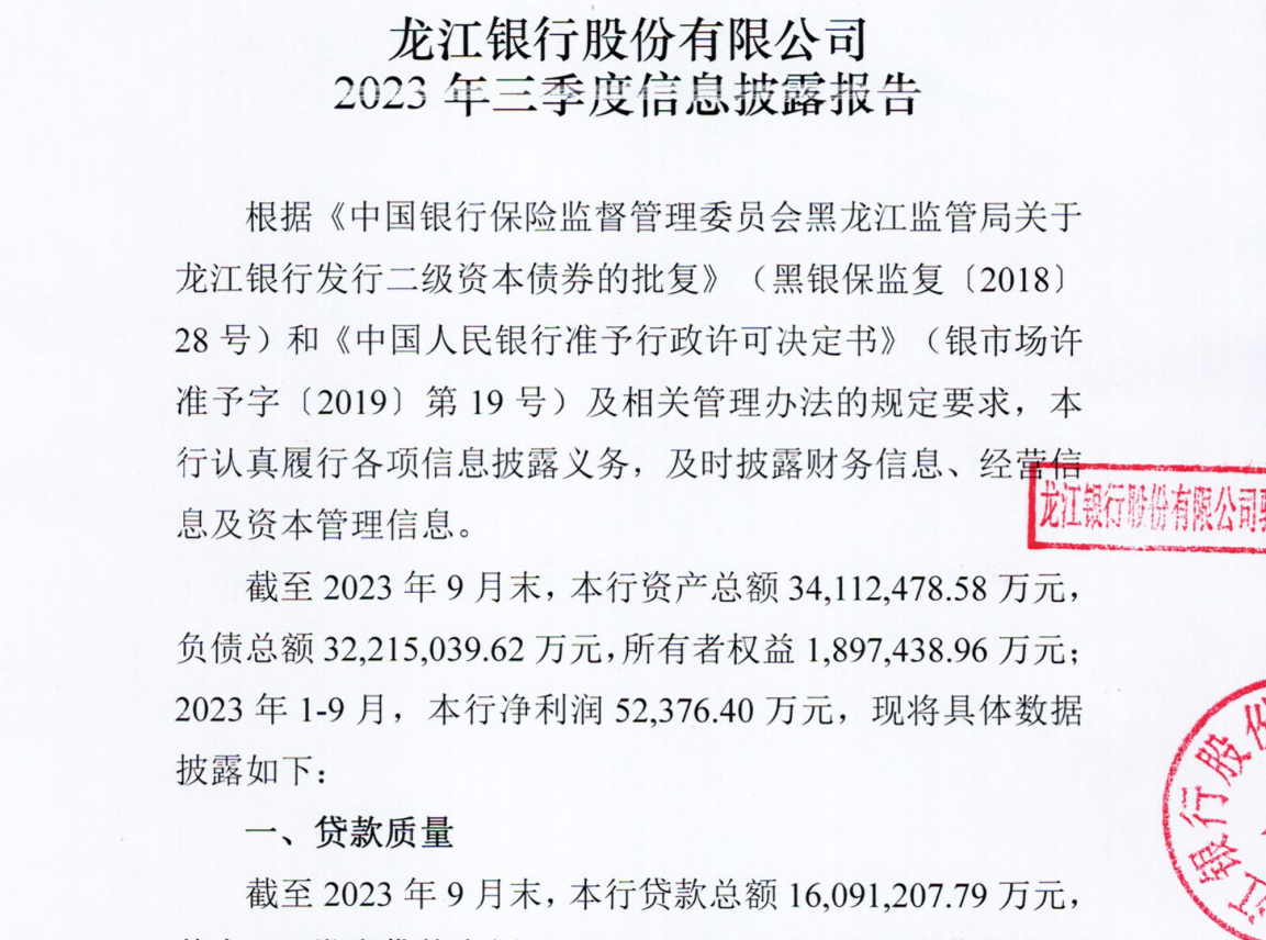(龙江银行2023年三季度信息披露报告截图:中国货币网)