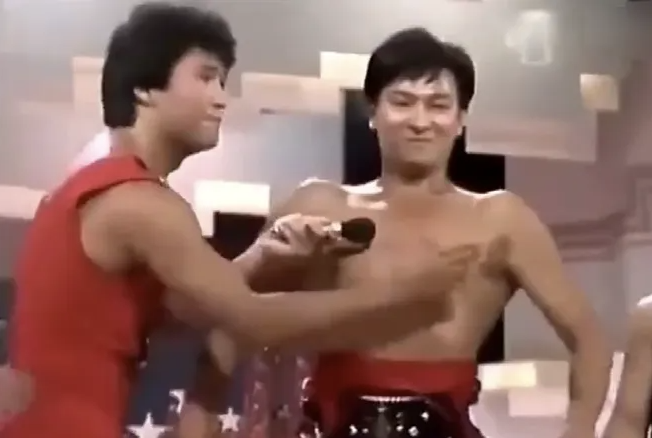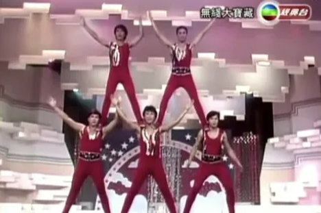 这是刘德华出道的第三年,无线正在推著名的“五虎将”(梁朝伟刘德华黄日华苗侨伟汤镇业)。刘德华胸口碎大石的节目其实还有前半段,“五虎将”集体穿上健美紧身衣表演,真的要做杂技动作哦。