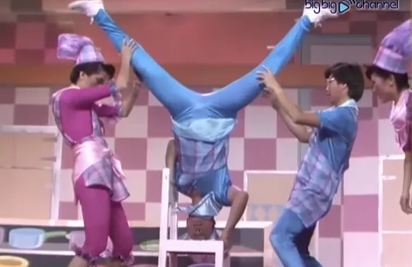 (△梅艳芳、张国荣、陈洁灵)这个凳子上倒立的是张国荣;
