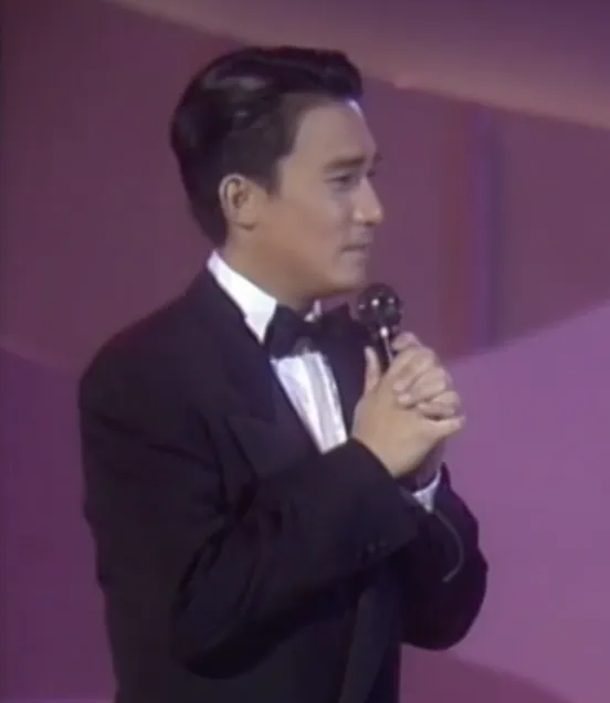 这类慈善娱乐节目的主持人也都很重磅,会有影帝影后来帮忙。1990年主持《星光熠熠耀保良》的梁朝伟,乖乖的,双手十指交握拿话筒,镇定中透着一丝社恐。