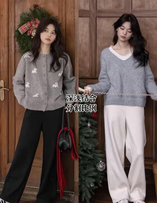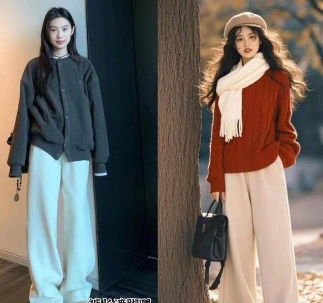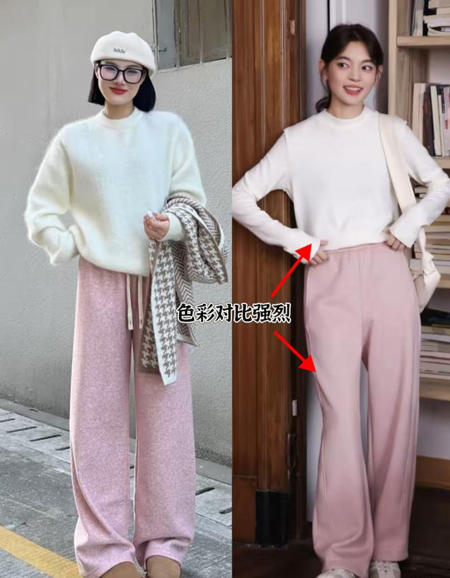 深色系的糯米裤,穿在身上显腿细一圈,上半身配浅色针织衫、衬衫或卫衣,衬肤显白又能提亮肤色;下半身显瘦的女生,可以尝试一下浅色糯米裤,搭配深色上衣更具丰富性。
