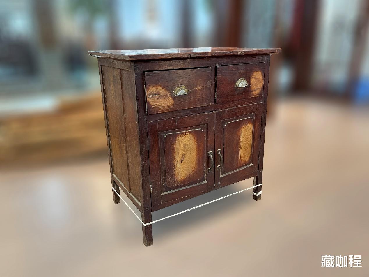 橱柜的器型和工艺都比较普通,一般人眼里只不过是旧家具。迎面有四大块漆层被刮掉,露出里面木头的颜色,有经验的木友立刻就来了兴趣。