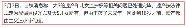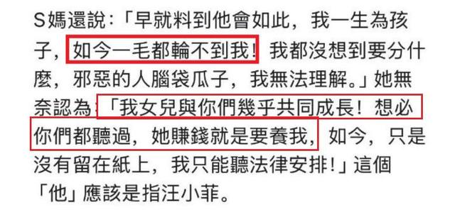 当了大S这么多年的发言人和理财人,如今后续经济来源没了,一向对这些物质条件看得比较重的S妈,内心显然一下无法平衡。要不然,她也不会对外说:“大S赚钱就是要养我,如今只是没有留在纸上,我只能听法律安排。”