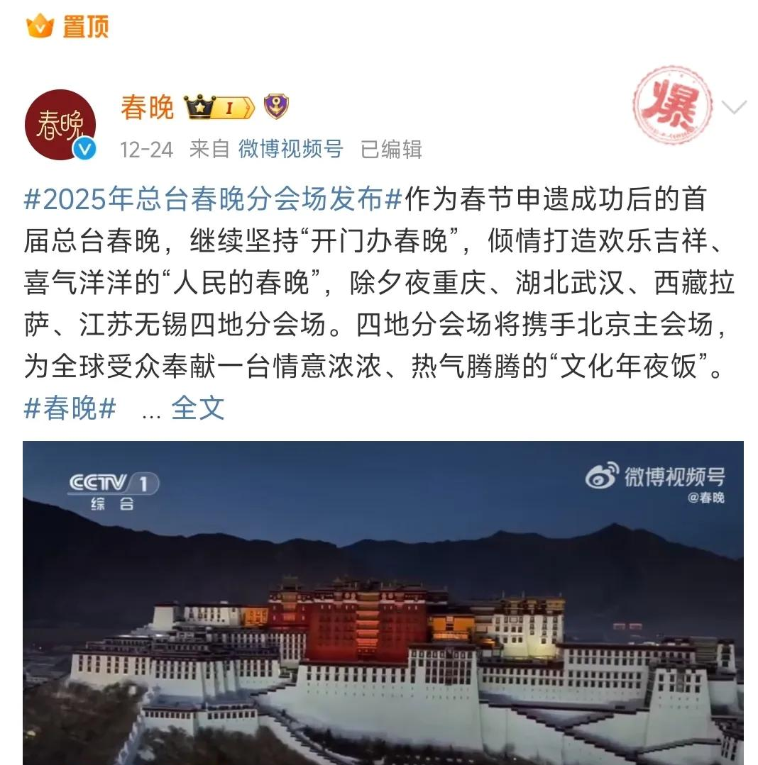 除此之外,今年的春晚分会场也已经确定,分别为重庆、武汉、拉萨、无锡四座城市。