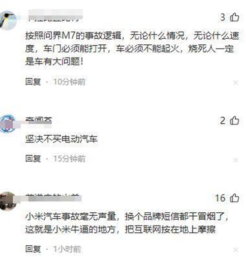 咱们说到底啊,大家不是光盯着这一起事故,咱是担心整个新能源汽车的安全性啊。现在电动车好多家庭都买了,谁也不想自己的车就像个“不定时炸弹”似的,不知道啥时候就把命给要了。社交媒体上大家讨论得也很热闹,有人就觉得小米刚入局汽车行业,可能安全性上有短板,有人说哪个品牌的车没事故啊,不能因为这一个就否定整个小米。还有人把这事儿提高到整个新能源汽车的安全标准上去了,说这标准是不是得提高提高。