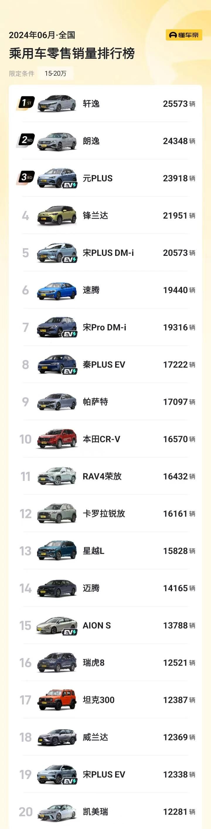 2024年6月,国内15至20万元价格区间的乘用车市场表现出色,各大品牌车型在该价格区间内竞争激烈。随着新能源车型的不断涌现,以及传统燃油车的技术提升,消费者在购车时有了更多的选择,市场整体销量也呈现出增长态势。