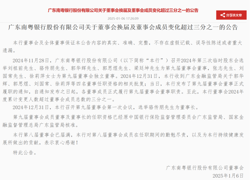 广东南粤银行近日公告称,已于2024年12月31日完成董事会换届选举,并召开了第九届董事会第一次会议。本次换届选举产生了8名新任董事,其中骆传朋再度当选为董事长。