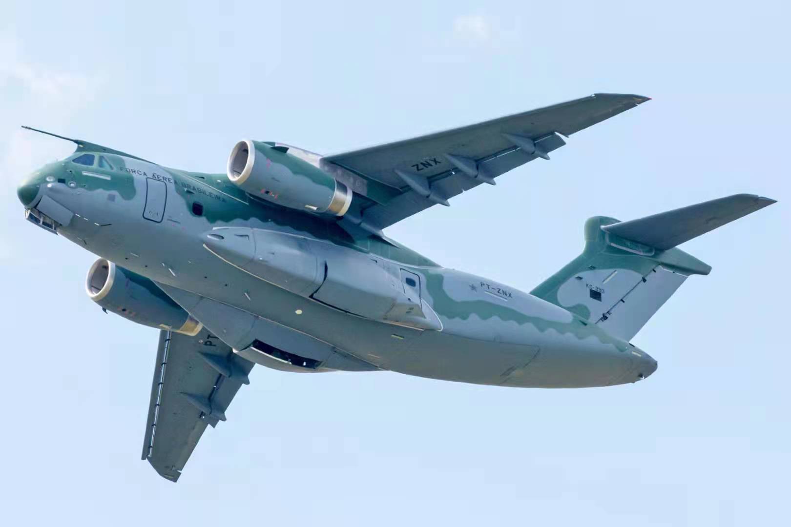 KC-390运输机:巴西航空工业公司研制,一家生产喷气式支线客机的企业,2019年实现量产,于日本C-2运输机相似,也装备两台涡扇发动机,最大航程6000千米,最大载重26吨,可运载巴西EE-11装甲车,具有一机多用的特点。