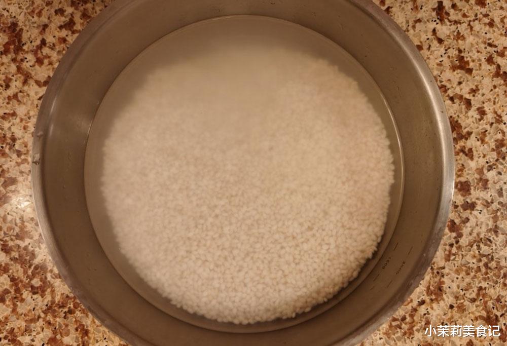 1、糯米是需要提前准备出来的,首先将糯米倒进盆子里边,加宽水淘洗两次,之后换上干净的水,可以多一些,泡4个钟头以上,这一步是必不可少的,它可以让糯米吸饱水,那么在煮的时候能够节省一部分时间,更为重要的是泡过糯米煮熟后口感更加软糯浓香。