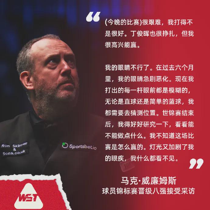 今日在特尔福德举行的 Sportsbet.io 球员锦标赛期间,威廉姆斯迎来了自己 50 岁生日。尽管他在首轮比赛中击败了丁俊晖,但他表示:“我的眼睛彻底不行了。在过去的六个月里,视力下降得非常厉害。一开始只是看远的东西模糊,但现在看什么都模糊。”