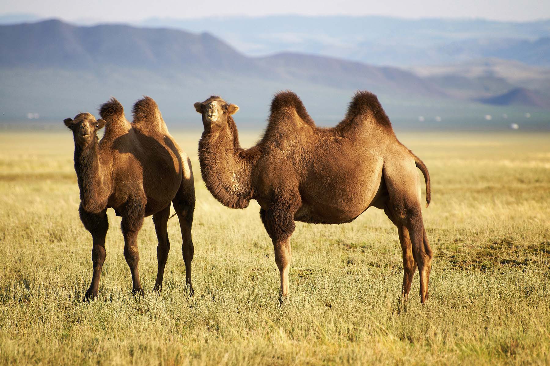 双峰驼以其两个驼峰而著称,这两个驼峰用于储存脂肪,当食物和水匮乏时,动物可以将脂肪代谢为能量和水。它们有长而蓬松的头发,有助于保护他们免受极端温度的影响,它们的脚又宽又软,这有助于它们在沙滩上行走而不会沉没。