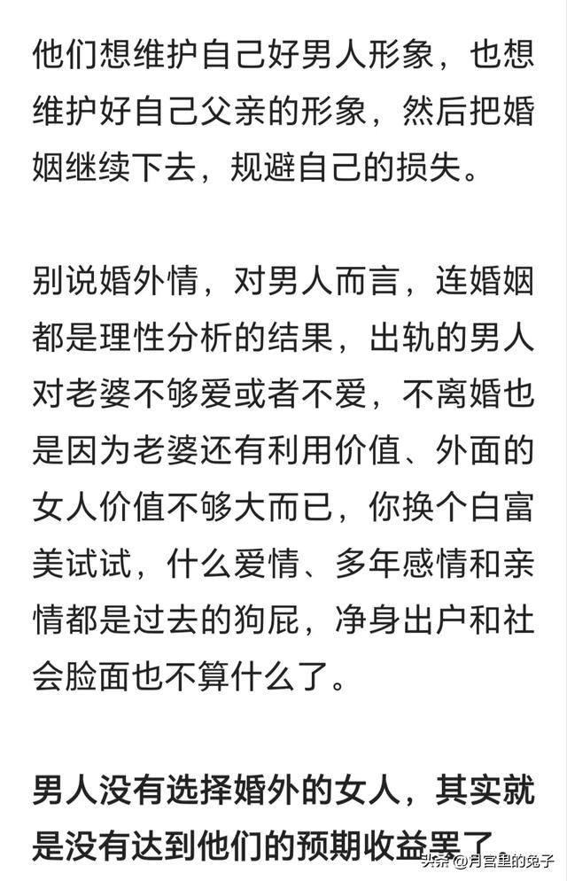 婚外的男人都有一个统一的德行套路,他找你容易你找他难。除了刚开始认识时候对你的热情,拥有你之后不是忙就是累,除开这些要么就是在聚会[流泪]。回家就把你拉黑,嘴上说的爱你如珠似宝,只要你提钱就闭嘴了就装傻了。但是等到他寂寞了想要找你亲亲的时候,他才又重新对你热情的聊天甜言蜜语殷勤体贴。