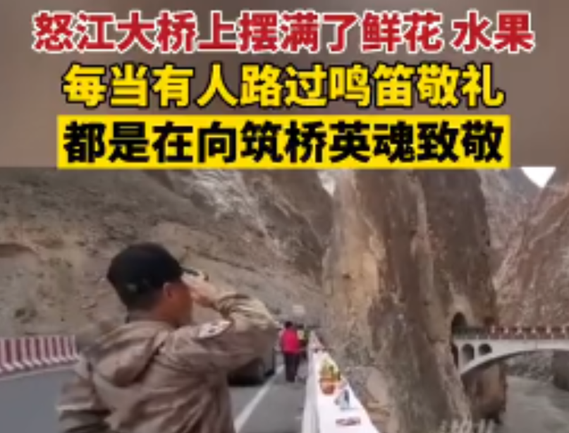 来往的车辆为了纪念这些为了建桥而牺牲的战士们,自发性的在桥上放上水果和饮料,甚至还有人鸣笛纪念。