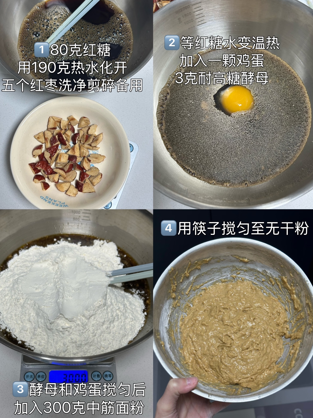 🌀 2. 🌶️等红糖水变温热后,加入一颗鸡蛋和3克耐高糖酵母。