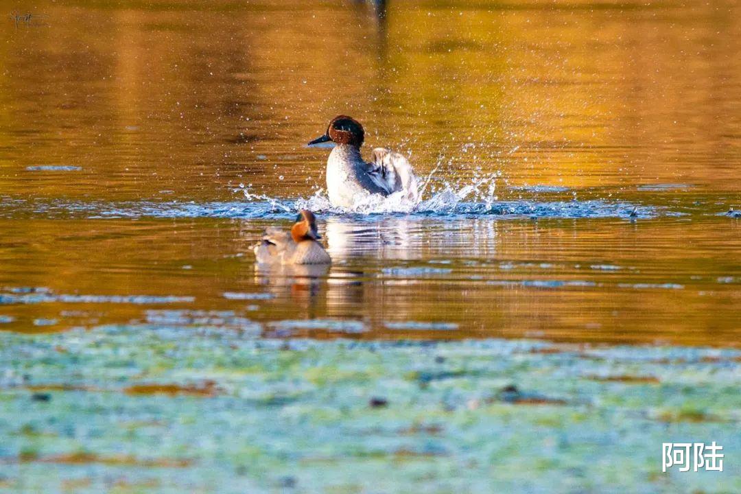 两种野鸭的警惕性很高,基本上都跟人保持上百米的距离,大部分时候蜷缩成一团浮于水面,晒着日光浴。偶尔才会互啄嬉戏一番,要说它们什么时候最漂亮,莫过于玩累了以后张开翅膀扑腾扑腾那几个瞬间。