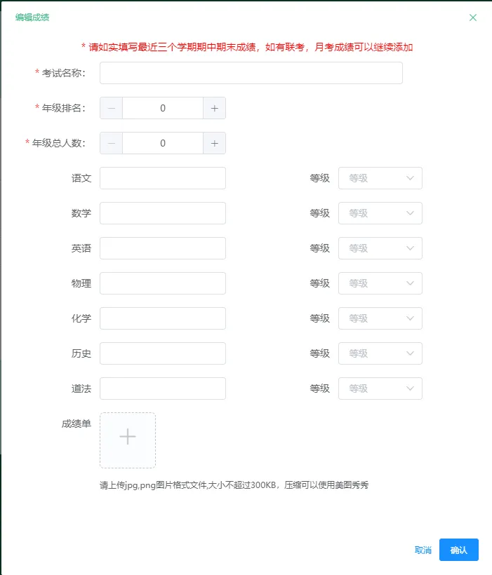 备注:这里的成绩信息是可以实时更新的,同学们在参加完初三的几次大考后,可以将成绩、排名等信息及时填写进来。