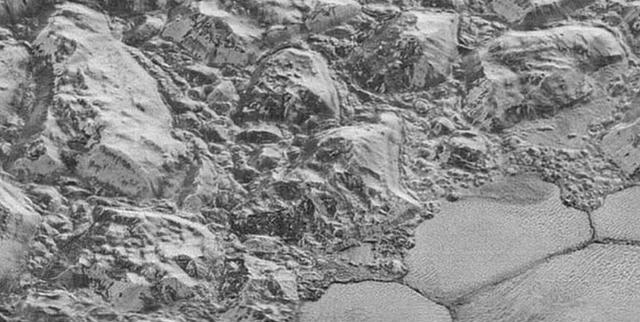 冥王星表面的山地地形是非常复杂的,比地球的山脉更加密集,均匀分布在星球表面的各个角落。