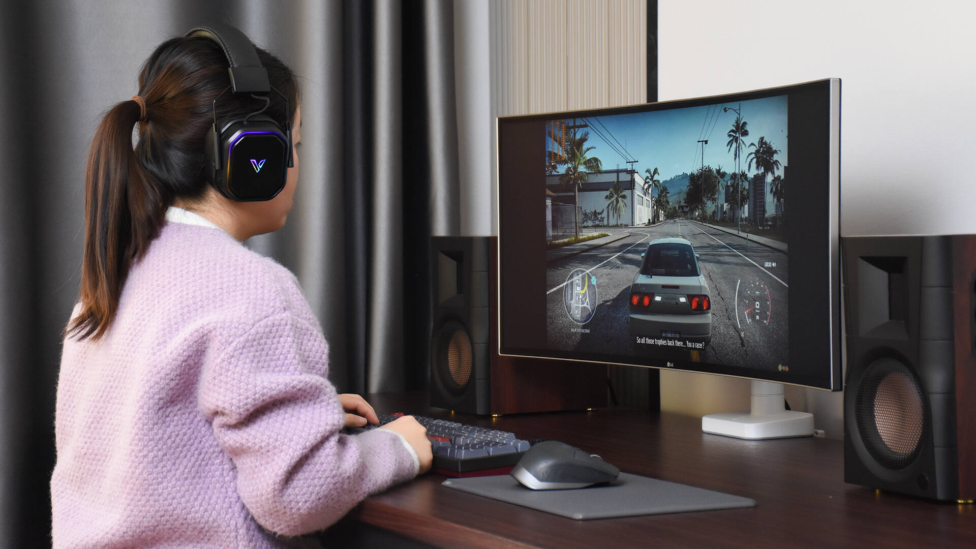 玩《极品飞车》的时候,雷柏VH850能够充分的营造出沉浸的氛围感,车子发动机的轰鸣声、踩刹车时轮胎和地面的摩擦声、车子的碰撞声,还有节奏感十足的背景音乐,都呈现的恰到好处。最难得的是,这么多复杂的声音似乎是从不同方向、不同距离传过来的,分界很明确,一点儿都不觉得浑浊。