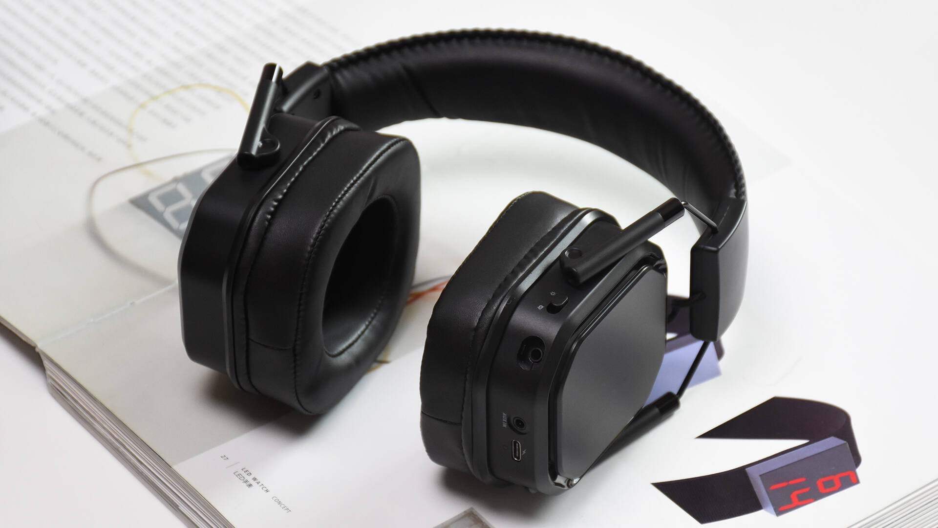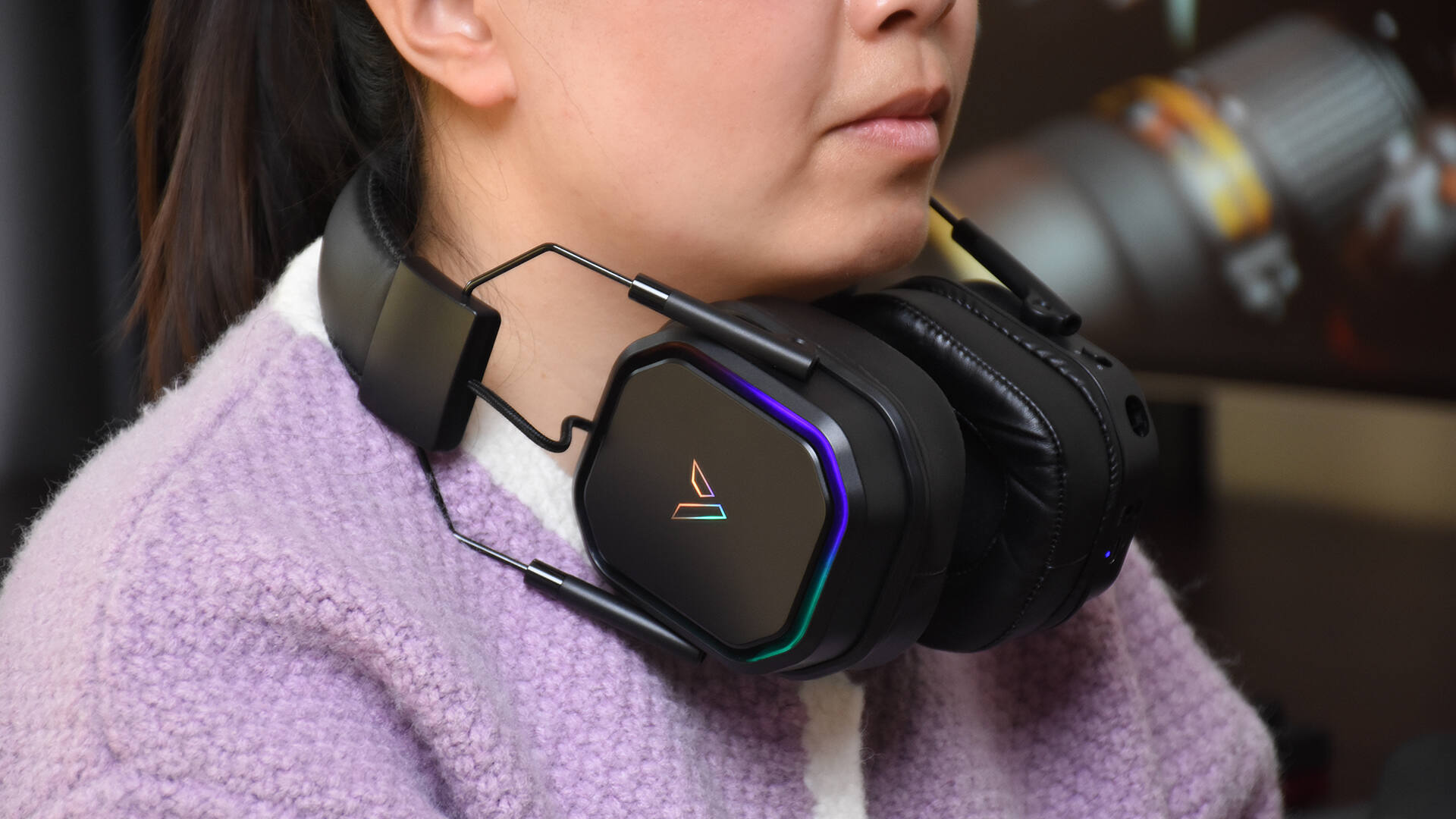 初上手这款耳机就有股很强的电竞风,通体黑色搭配耳罩外侧的RGB氛围灯、头梁和耳罩内侧厚实的填充和蛋白皮包裹,还有方形的耳罩设计,很难不把它和游戏、电竞这些词联系到一起。