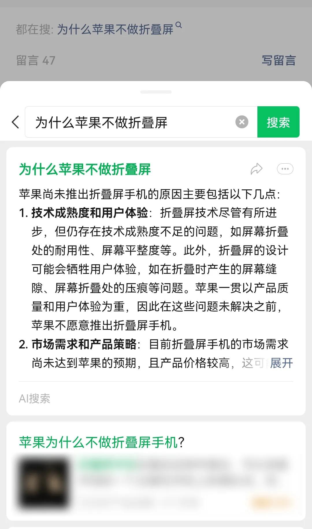 其搜索结果会优先展示AI内容,如果你还有其他想要搜索的问题,也可以在当前的半屏状态下,在搜索框中重新输入内容进行搜索。
