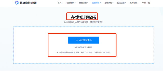 在顶部的“视频编辑”的下拉选项框里就能找到所需的【视频配乐】了,接着在自动跳转界面上传所需视频文件,支持mp4和mkv格式,大小不要超过20M。