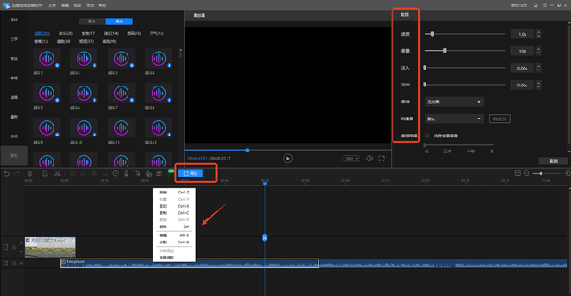 拖动可调整配乐的开始时间,选中配乐轨道鼠标右击还能进一步调整音频的速度、音量等参数,剪切、分割、声音提取等也支持,最后导出就能得到并使用了。