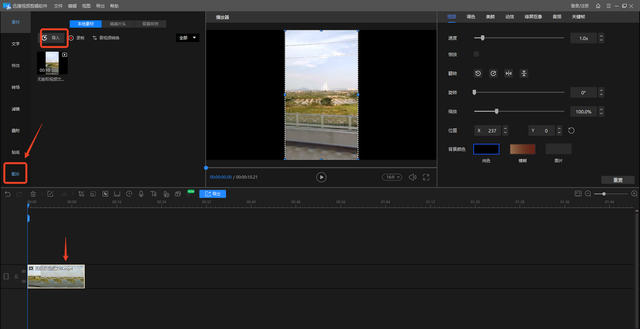 打开后先点击页面的“+新建”,接着在跳转页面的左上方就能看到“素材”分类下的“配乐”选项了。然后导入视频文件,并将其拖拽到下方的时间轴上。
