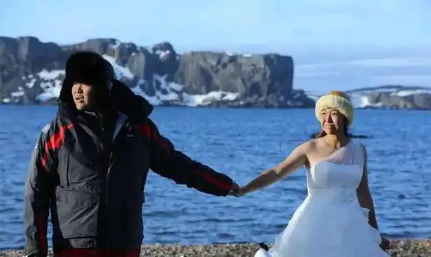 梁红身穿白色婚纱,在企鹅的见证下,与张昕宇举行了极地婚礼,完成了他们浪漫的爱情梦想。