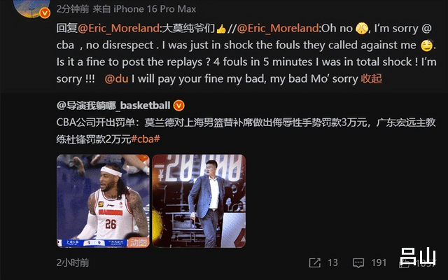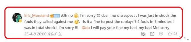 不过莫兰德并不因为从轻处罚而放弃反击,在给网友的网上留言中他写道:对不起,我没有对CBA官方有不尊重的意思,我只是对裁判的判罚感到震惊。我现在发点比赛回放会被罚款吗?5分钟吹了我4次,这有点那啥吧!