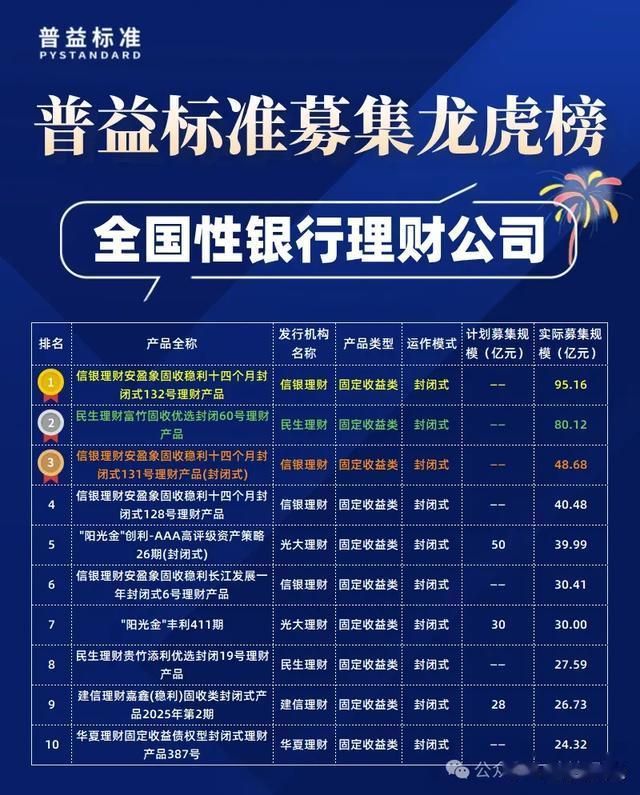 本期总榜单中,信银理财“信银理财安盈象固收稳利十四个月封闭式132号理财产品”摘得桂冠,其实际募集规模为95.16亿元;民生理财“民生理财富竹固收优选封闭60号理财产品”排名第二,其实际募集规模为80.12亿元;信银理财“信银理财安盈象固收稳利十四个月封闭式131号理财产品(封闭式)”排名第三,其实际募集规模为48.68亿元。