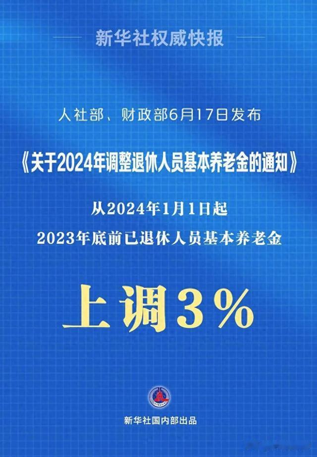 据央视新闻,2024年1月1日起,为2023年底前已按规定办理退休手续并按月领取基本养老金的企业和机关事业单位退休人员提高基本养老金水平,总体调整水平为2023年退休人员月人均基本养老金的3%。