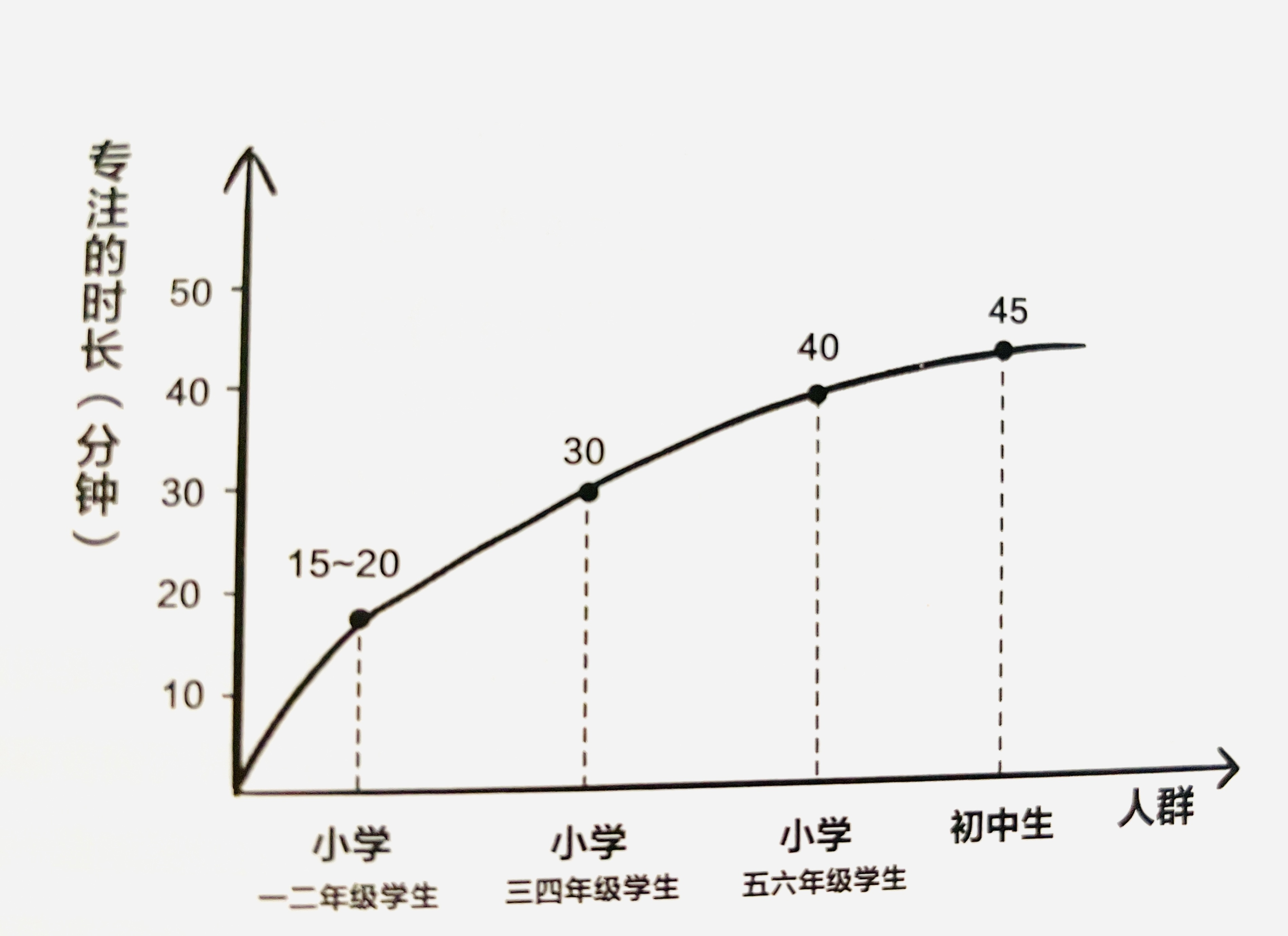 小学生的专注力时长也极为有限,一二年级为15-20分钟,三四年级为30分钟,五六年级为40分钟。