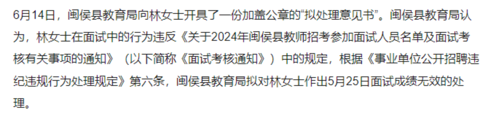 正当林女士等待参加入职体检时,却发现自己的名字已被排除在体检名单之外。闽侯县教育局给出的理由是,林女士在面试中的行为违反相关规定,涉嫌考试违规,成绩无效。