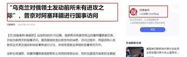 信息来源:观察者网 2024-8-19 《“乌克兰对俄领土发动前所未有进攻之际”,普京对阿塞拜疆进行国事访问》