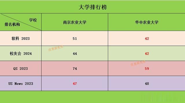 大学排名2023年软科、校友会、QS等国内外高校排名机构的大学排行榜中,华中农业大学皆高于南京农业大学,仅有US News南农比华农高1位。
