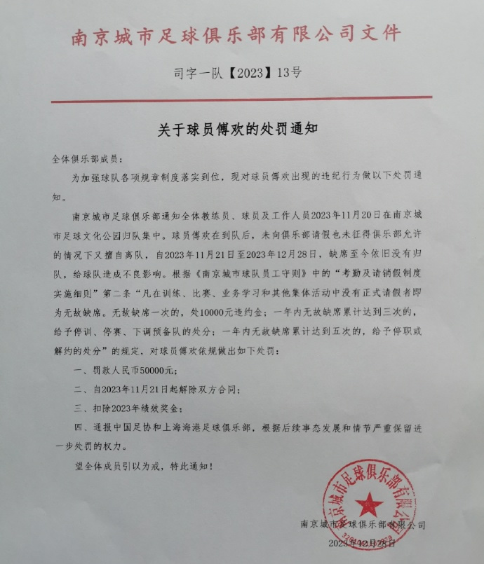 从上图这份公告中可以看到情况原来是这样子的:本来11月20日是球员归队时间,这一天傅欢也回来报到了。然而报到结束后的第二天,就发现他擅自离队,直到12月28日还没归队。球员整整离队38天,这是非常严重的情况,于是乎俱乐部发出处罚公告。